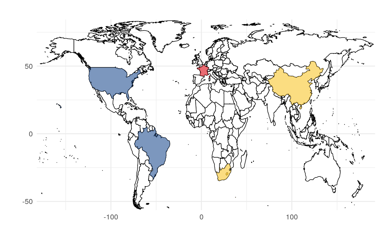 A custom map made with custom colors using ggplot2.